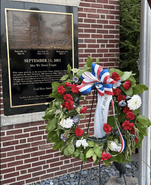 Representatives from the town’s emergency services escorted a memorial wreath from Town Hall, placing it at the fire station’s 9/11 memorial. Soloist Nancy Le ville sang ‘God Bless America’.