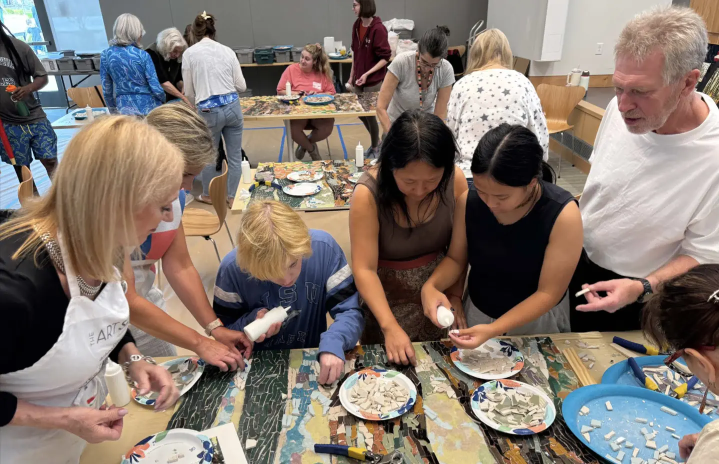 In true community fashion, dozens of young and old New Canaan ‘volunteer artists’ gathered late last week and over the weekend in New Canaan Library https://www.newcanaanlibrary.org to help create a mosaic mural, soon to be installed under the balcony in the library’s Cioffi Family Living Room. This project has been made possible by a generous grant from the Horizon Foundation. According to the library, “This large-scale work of art will engage visitors and reflect the Library’s place as a haven for wonder, reflection, and timeless exploration for years to come.”