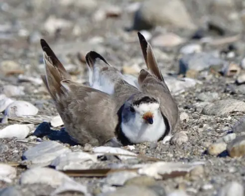 April 21th. Her four speckled eggs resemble beach stones. They will hatch in 27-35 days. Both she and her mate incubate, often remaining still for 30 minutes or more before swapping places to go feed. Their sand-colored bodies are adorned with black bars across their chest and brow, a two-toned orange and black bill, and orange legs. This color pattern breaks up their outline, helping them blend perfectly into their surroundings. This camouflage is their first defense against the many predators which hunt on the open beach. When a predator strays too near the nest, the sitting Piping Plover, like its cousin the Killdeer, races away, calling, hoping to capture the predator’s attention. If the predator doesn’t follow, then more extreme measures are employed – the plover feigns injury by dragging a wing, fanning its rust-colored tail, and flopping about while calling; this usually draws the predator away. Once the predator is deemed sufficiently far from the nest, the seemingly wounded bird miraculously recovers and flies in a wide arc returning to settle back onto the nest.