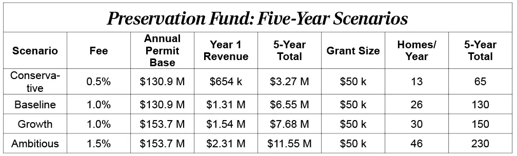 With permit values around $150 million a year, a 1% preservation fee yields $1.5 million annually — $7 million over five years. Half goes to operations and surveys, half to homeowner grants and incentives. That saves about 25 homes per year, 125 over five years through direct funding alone. Add zoning bonuses and tax abatements, and we could protect 200 to 250 homes — roughly half the architecturally significant houses in town — within a single decade.