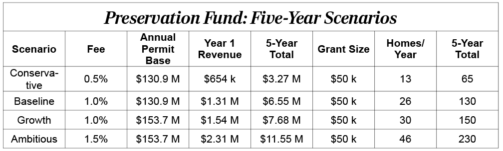 With permit values around $150 million a year, a 1% preservation fee yields $1.5 million annually — $7 million over five years. Half goes to operations and surveys, half to homeowner grants and incentives. That saves about 25 homes per year, 125 over five years through direct funding alone. Add zoning bonuses and tax abatements, and we could protect 200 to 250 homes — roughly half the architecturally significant houses in town — within a single decade.