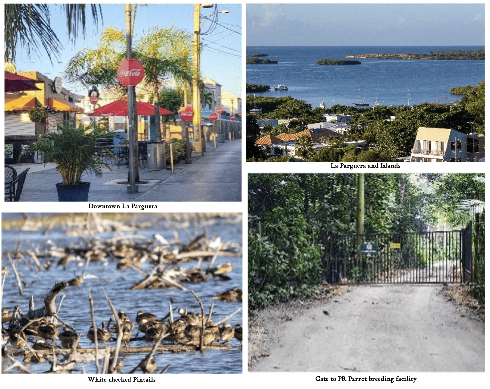 Of course, as soon as I arrived onsite, it started to rain. I’m used to getting wet in the tropics, so I stood under a wide-leafed tree before spotting a tractor with a covered cab parked nearby. I climbed into the cab, stored my camera gear and waited. At 3:50 p.m. I heard parrots. It was still raining, so I left my gear and ran up the hill to the gate. I was greeted there by a raucous group of 16-20 emerald PR parrots with rusty foreheads flying in and out of some palms! I walked back to my car with a smile on my face and a two-hour drive to my hotel in the coastal tourist town of La Parguera.