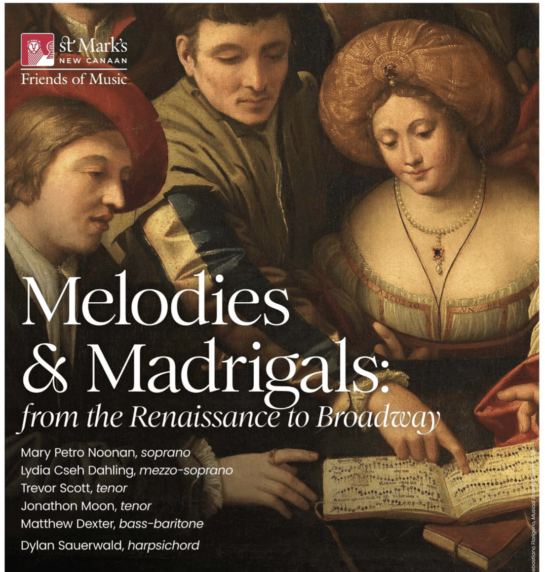 The Friends of Music at St. Mark’s Episcopal Church, New Canaan, CT, present Melodies and Madrigals: from the Renaissance to Broadway; Saturday, February 28, 2026, at 6:00 PM, St. Mark’s Episcopal Church, 111 Oenoke Ridge, New Canaan, CT.