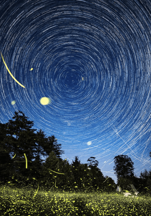 In Connecticut, Vigdor photographed a private firefly sanctuary in New Canaan maintained by Bill and Mary Ellen McDonald. To capture the density of fireflies against a night sky centered on Polaris, he used stacking software originally designed for star trails, layering 160 images into a single composite.