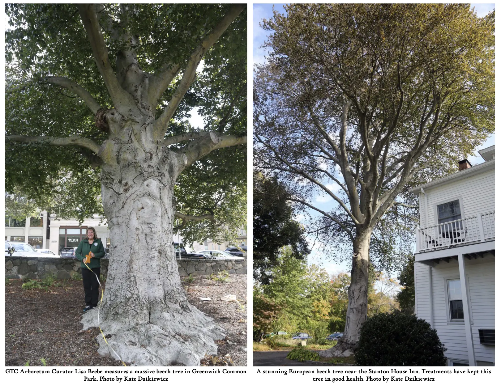 American beech trees are a foundational species in many Connecticut forest ecosystems and among the most common native trees in our region. Their nuts provide a rich source of protein and fat for wildlife, including squirrels, wild turkey, black bears, and numerous bird and small mammal species. In good health, beech trees can live an extraordinary 300-400 years and when grown in open areas such as parks and yards, their trunks may reach two to three feet in diameter. Connecticut is home to several remarkable specimens, including a magnificent beech in Greenwich Common Park off Greenwich Avenue. This tree is part of the Greenwich Tree Conservancy’s town-wide Arboretum. Arboretum Curator Lisa Beebe found that the trunk measures 14.5 feet in circumference, or over four feet in width!