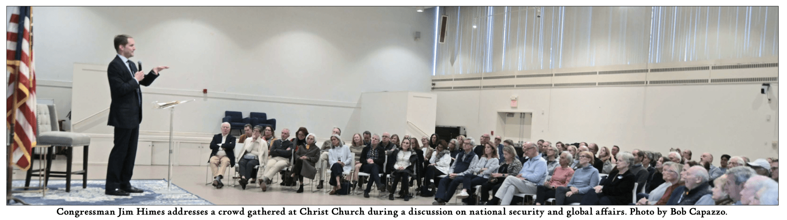 Congressman Jim Himes told the audience at Christ Church Greenwich that the United States is entering a more volatile global era defined by rising competition with China, unpredictable conflicts in the Middle East, and growing economic and technological pressures at home.