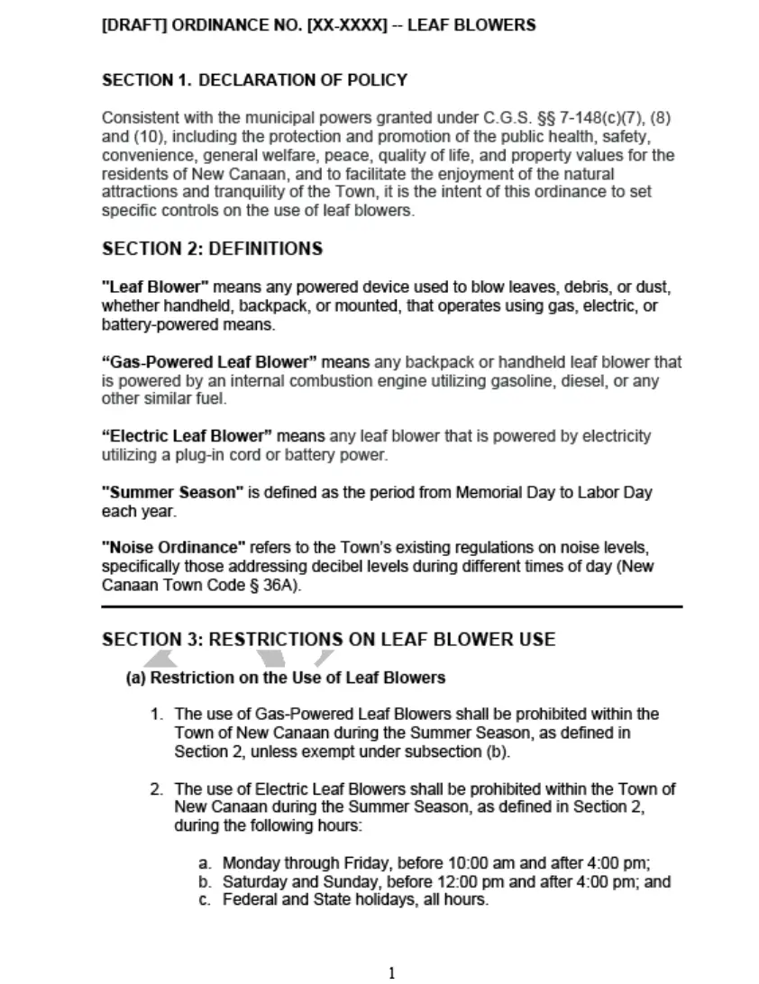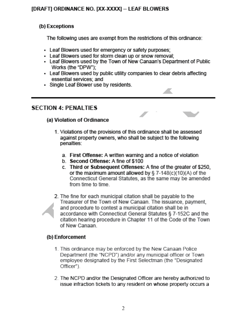 The draft ordinance would prohibit the use of gas-powered leaf blowers between Memorial Day and Labor Day, with exceptions for single use by residents and certain other specific needs, including for storm clean-up and safety reasons. Use of gas-powered leaf blowers by the Department of Public Works is also exempted in the draft ordinance. Electric leaf blowers would remain permitted, but with tighter time restrictions than in the existing Town noise ordinance.