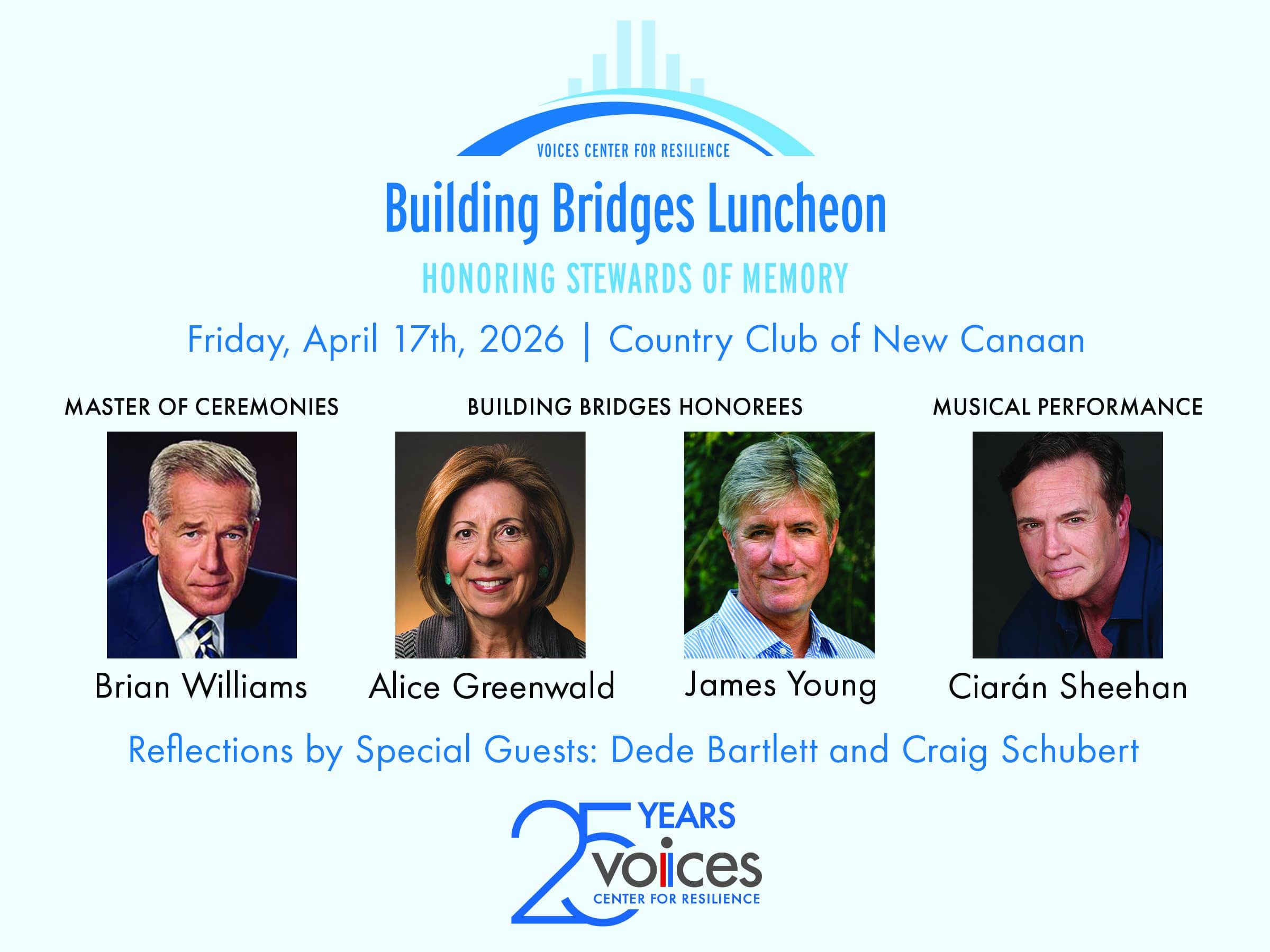 VOICES Center for Resilience will hold its 2026 Building Bridges Luncheon, “Honoring Stewards of Memory,” on Friday, April 17, at the Country Club of New Canaan. This September marks the 25th anniversary of 9/11 and the founding of VOICES in response to the attacks.