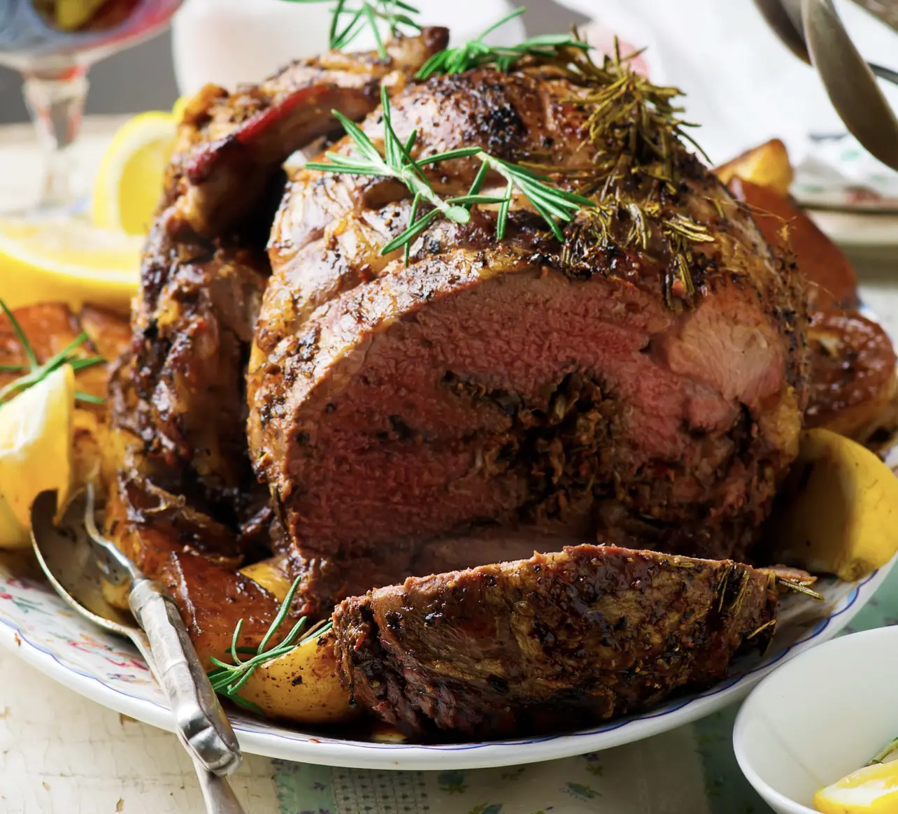 Leg of Lamb – All Other Types Here I recommend taking a knife with a long, narrow blade, such as a paring knife, and poke some holes in the lamb and stuff those holes with garlic cloves cut in half lengthwise. Assume 5-6 of these – more if you like garlic. Line the roasting pan with foil (eases clean up) and in the bottom add a peeled, quartered onion, a head of garlic cut sideways to expose all the cloves, and a sprig or two of fresh rosemary. Also pour some red wine and/or beef broth in the roasting pan to at most ¼ inch depth. Put the lamb in the pan. Mix some olive oil, dried rosemary, and diced garlic or garlic powder (assuming you like garlic) in a bowl and brush it over the lamb. Sprinkle the lamb with salt and pepper. Cook at 325 degrees until done, which is around 130-135 degrees internal temperature for medium rare. (Cooking time varies with size. Lamb with bones takes longer.) Use an instant read thermometer in the thickest part to test. Transfer done lamb to a carving board. If you want some bling, lay a sprig or two of fresh rosemary on the lamb to impress everyone before carving.