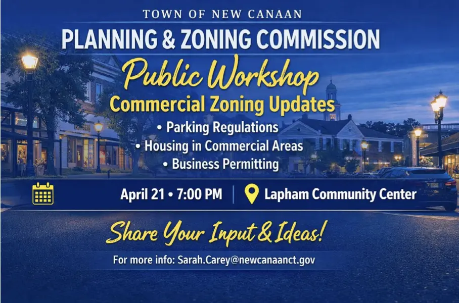 The New Canaan Planning and Zoning Commission will host a public workshop on Tuesday, April 21 at 7 p.m. at Lapham Community Center to discuss proposed updates to commercial zoning regulations. Topics include parking, housing in commercial areas, and permitting, with community feedback helping shape final revisions expected by July 2026.