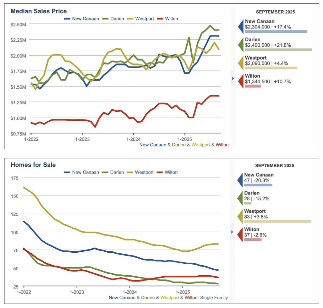 But that’s the national narrative — broad, optimistic, and detached from local reality. In our four Fairfield County towns, buyers don’t have more choices; they have fewer. Inventory is at record lows. Days on market are shorter. Months of supply are tighter than ever. Here, the story is the opposite: Competition is fierce, and choices are vanishing.