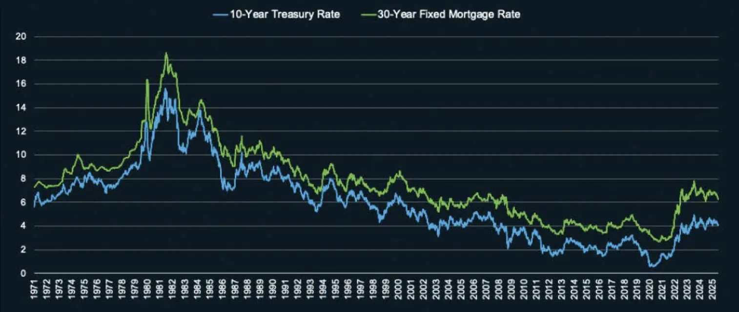 What about mortgage rates? They still move in lockstep with the 10-year Treasury yield, as they have for half a century. The 10-year is expected to drift lower over the next six months, and mortgage rates should follow. The spread between them, roughly two points, has held remarkably steady.