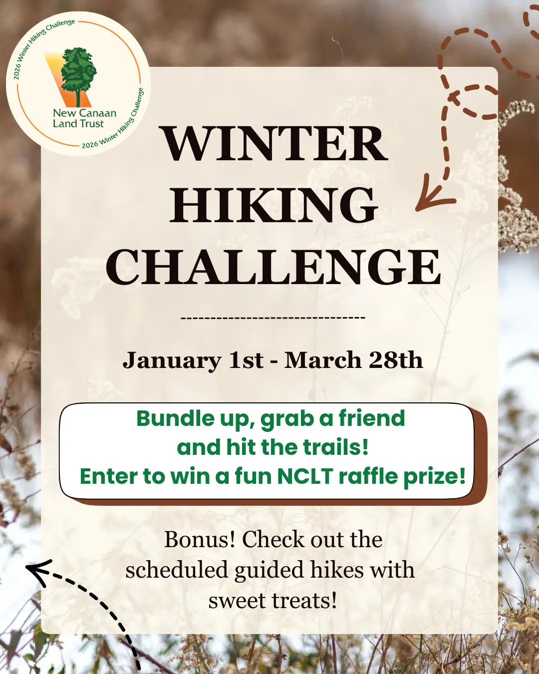 Bundle up, grab a friend and hit the trails! The Winter Hiking Challenge is live from January 1st through March 28th. Hike the trails at any or all of our open-to-the-public preserves. Take a photo of yourself